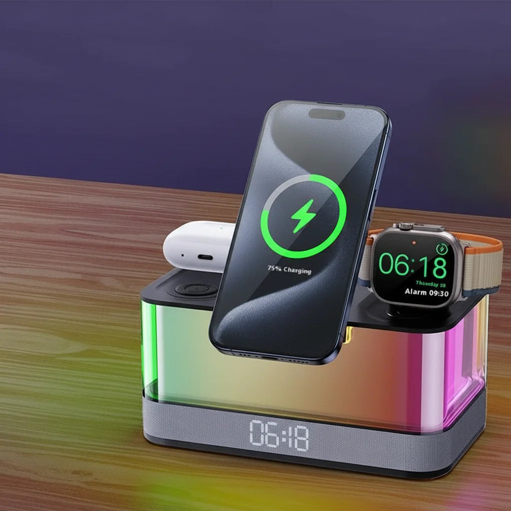 The AuraDesk Hub's magnetic wireless charging pad is compatible with all Qi-enabled smartphones, smartwatches, and wireless earbuds. Power up your essentials effortlessly and keep them ready to go!